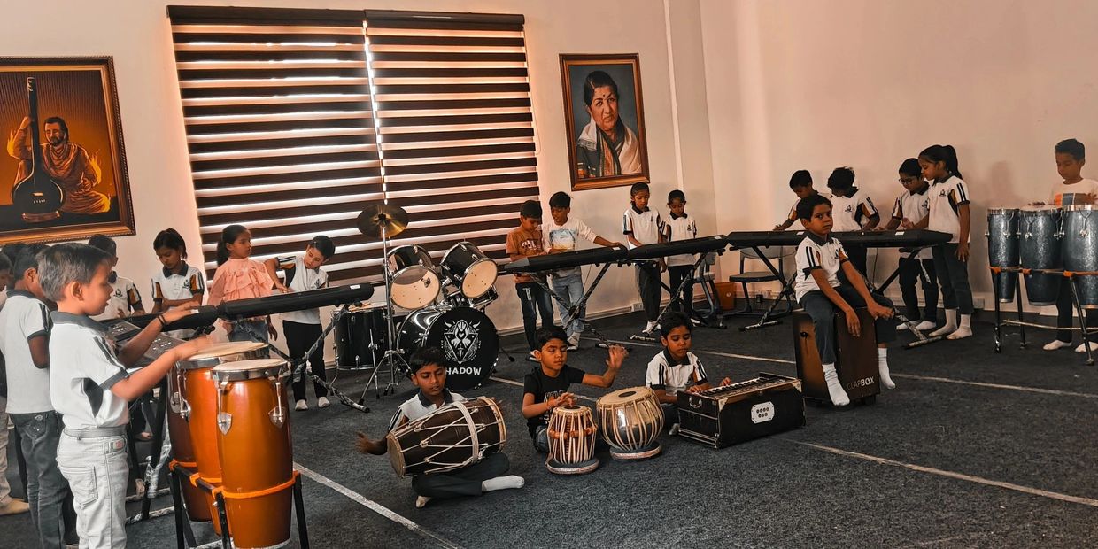 Our students also get hands-on training with a variety of musical instruments, including guitar, keyboard, dholak, tabla, harmonium, and other rhythm-based instruments. This practical exposure helps them understand melody, rhythm, and coordination, making learning both joyful and meaningful.